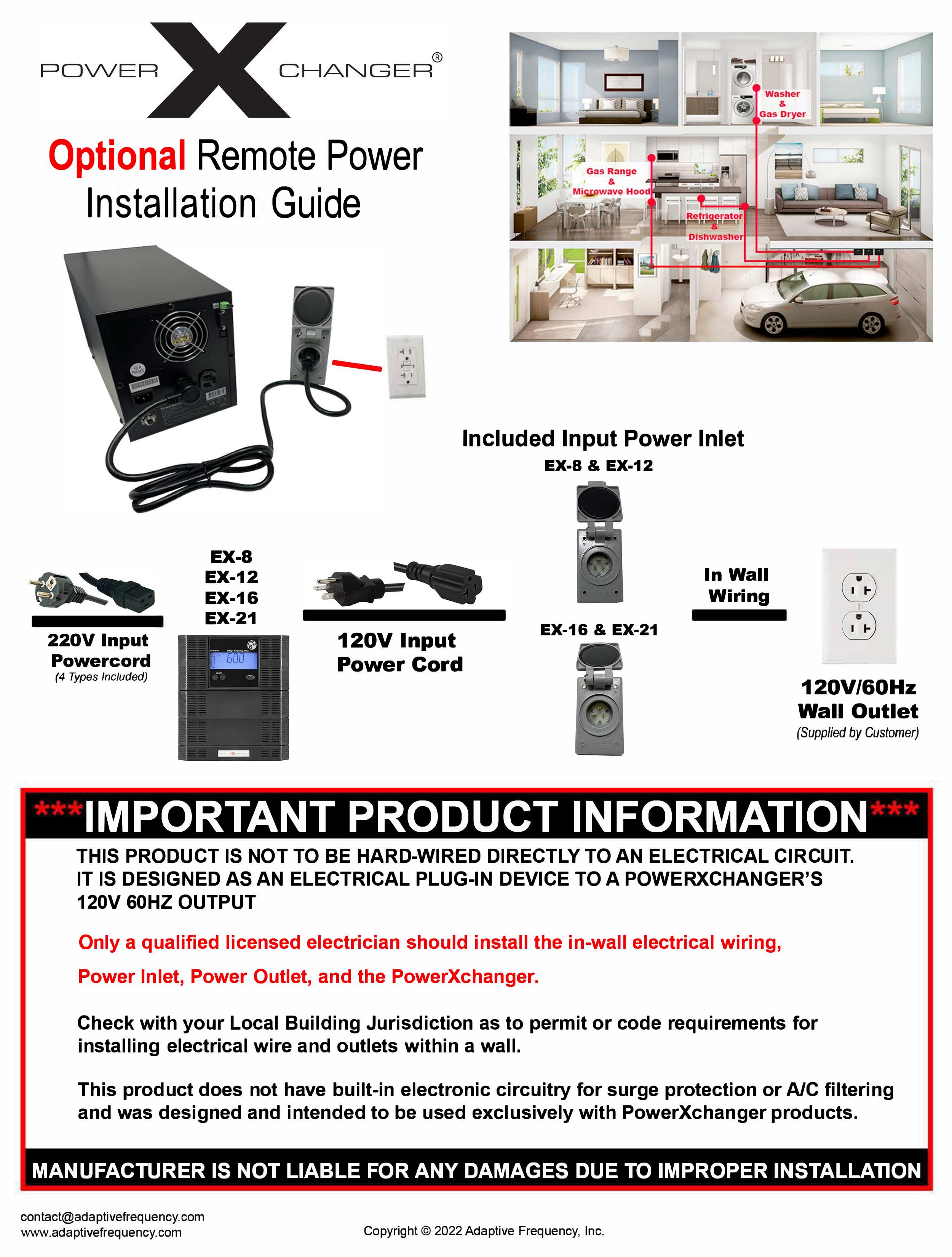 THIS PRODUCT IS NOT TO BE HARD-WIRED DIRECTLY TO AN ELECTRICAL CIRCUIT. IT IS DESIGNED AS AN ELECTRICAL PLUG-IN DEVICE TO A POWERXCHANGER'S 120V 60HZ OUTPUT.